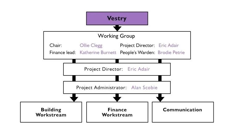 The chart below illustrates the internal structure we have established. The Vestry is responsible for key decisions, but it has delegated much of the day-to-day management to a Workiing Group. This is chaired by Ollie, and the other members are Katherine Burnett our Finance Director, Brodie Petrie the People’s Warden, and Eric Adair as Project Director. Eric is supported by Alan Scobie in the role of Project Administrator.
